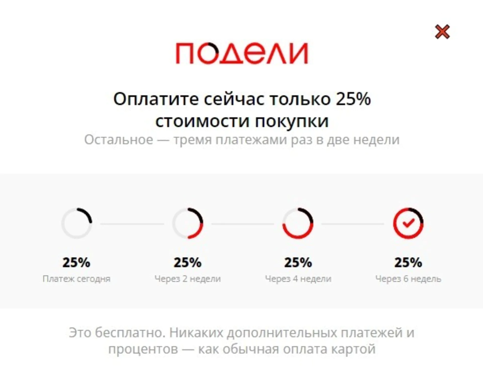• «Подели» — для билетов до 30 000 ₽: равные 4, 6 или 10 платежей с интервалом в две недели без переплат. Услуга доступна только на нашем сайте.