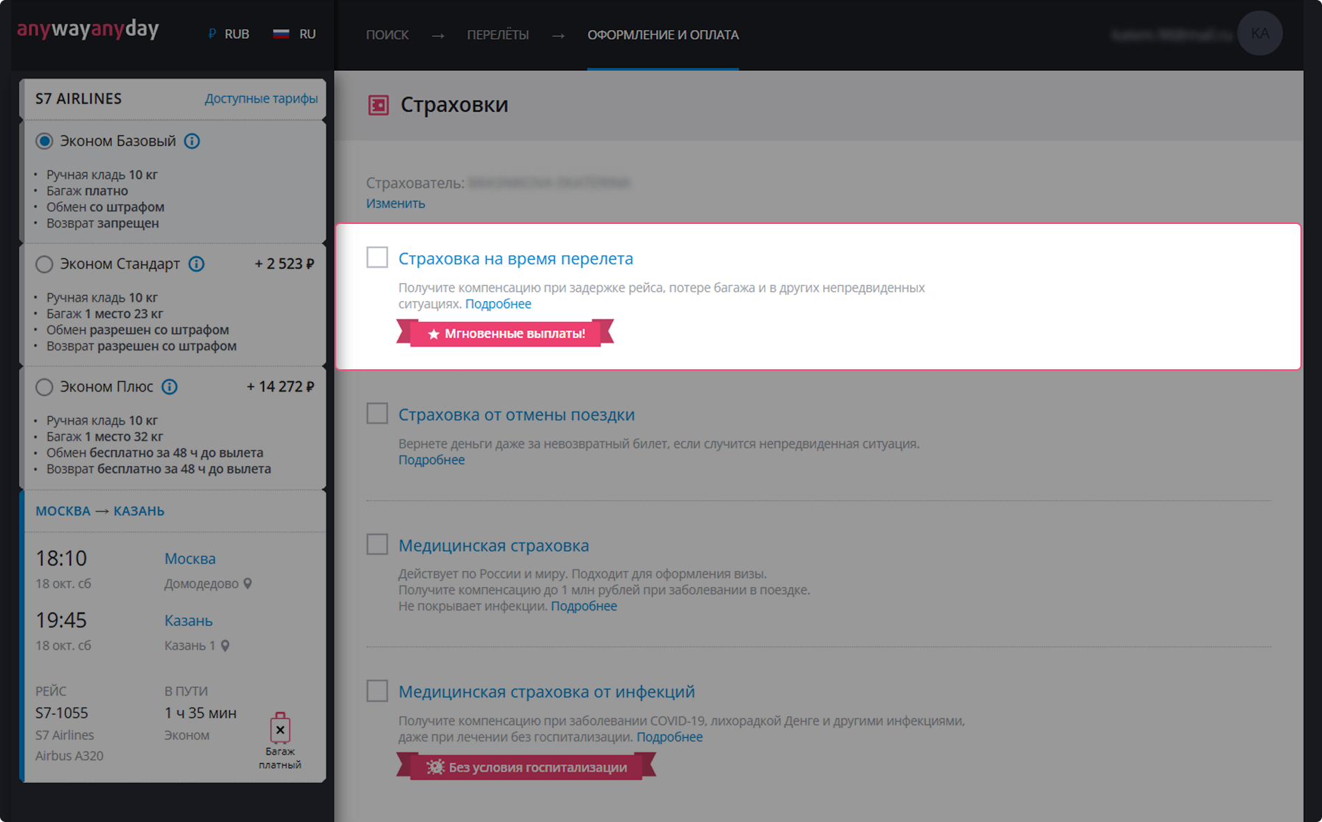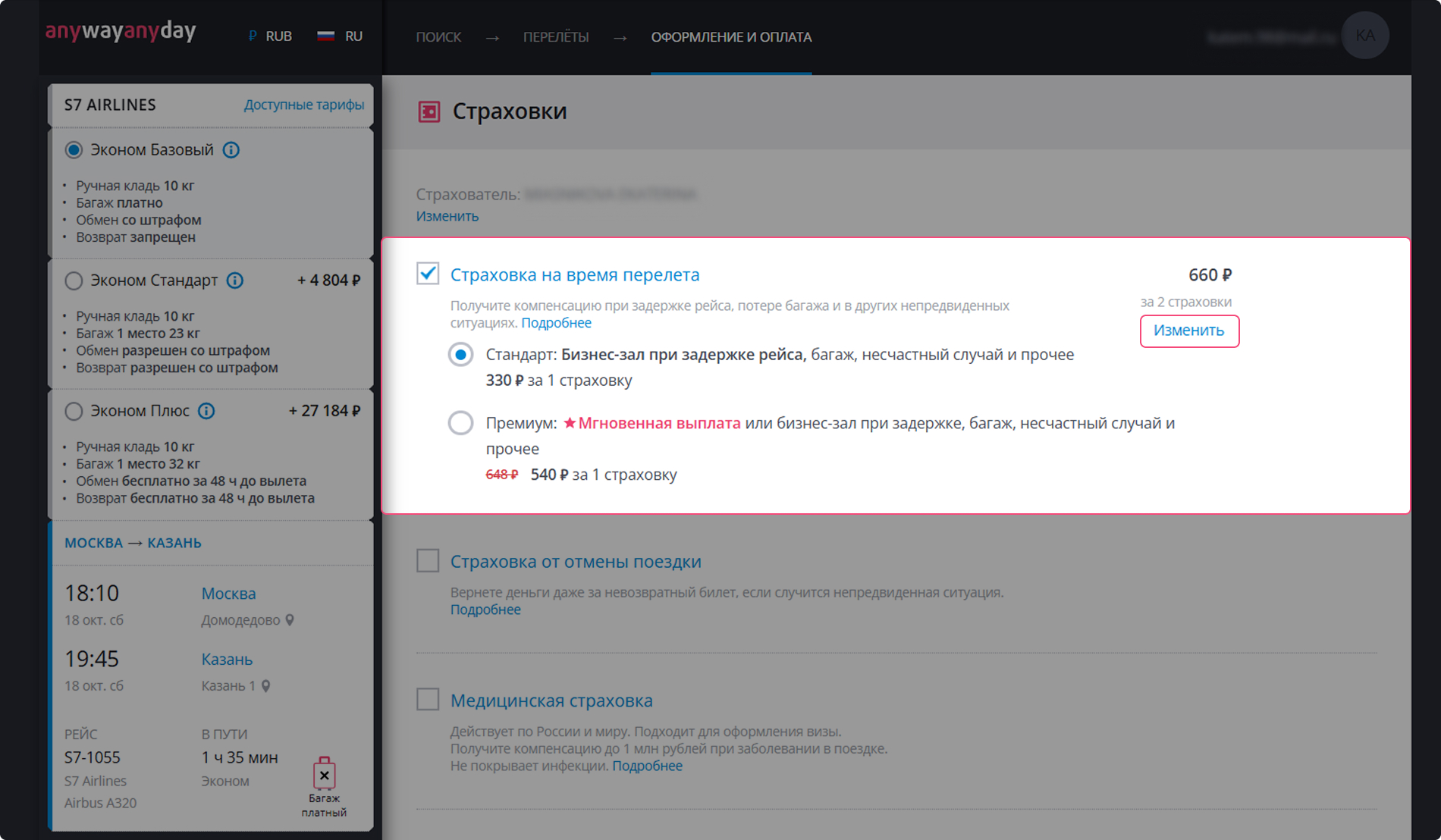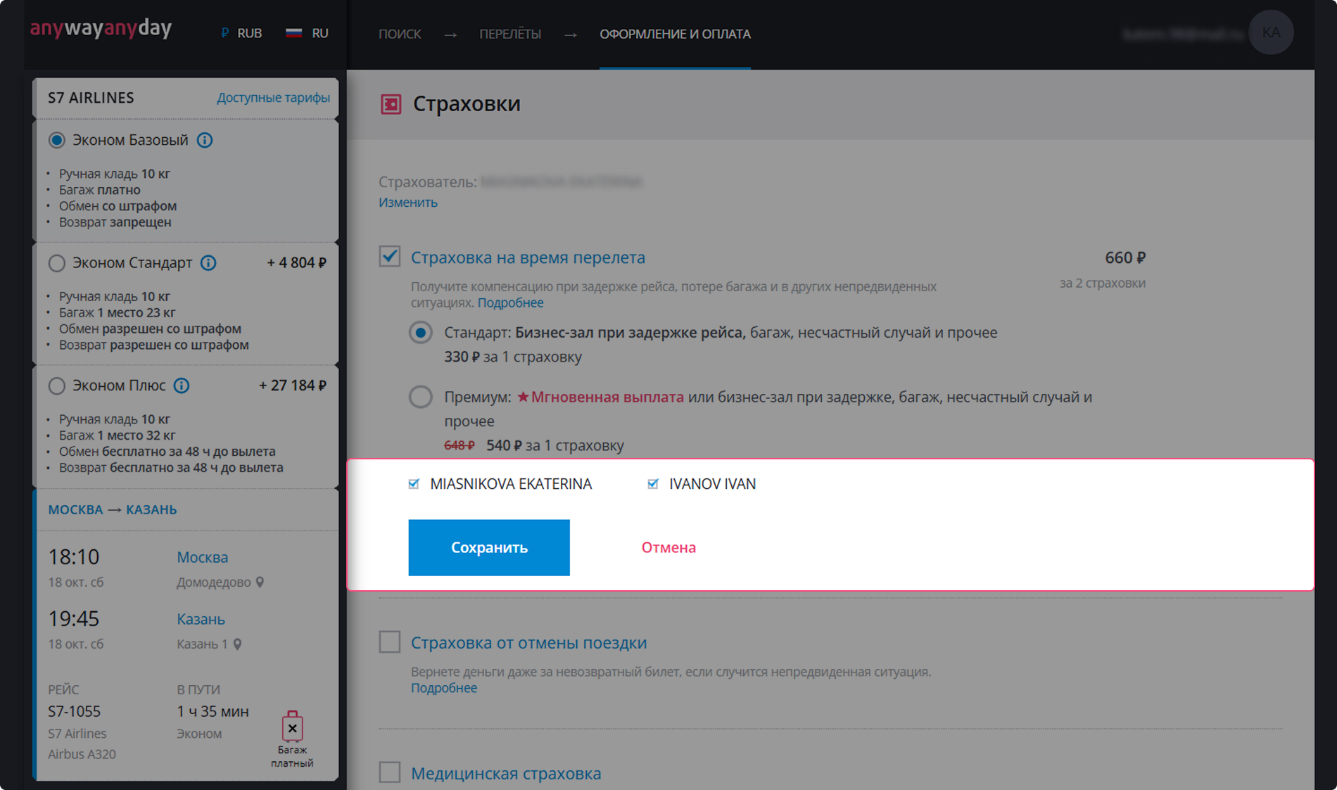 Выберите нужную страховку и пассажиров, которым нужен полис. Оплатите страховку.