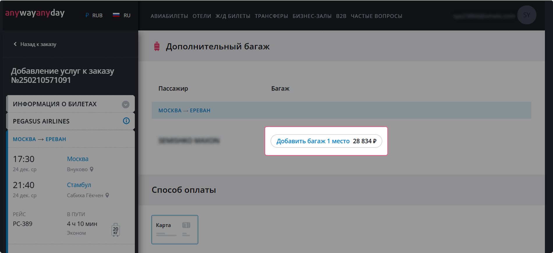 1. В личном кабинете на сайте Anywayanyday. Для этого выберите нужный заказ и нажмите кнопку «Добавить услугу», а затем выберите пункт «Дополнительный багаж» и оформите заказ.