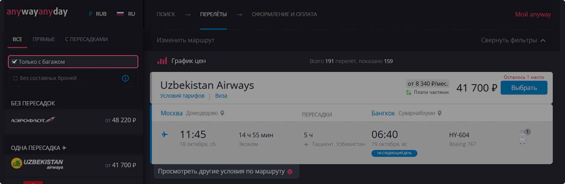 Чтобы купить билет с багажом на сайте Anywayanyday, проставьте фильтр «Только с багажом» при поиске рейса. После этого отобразятся билеты, в стоимость которых включен багаж.