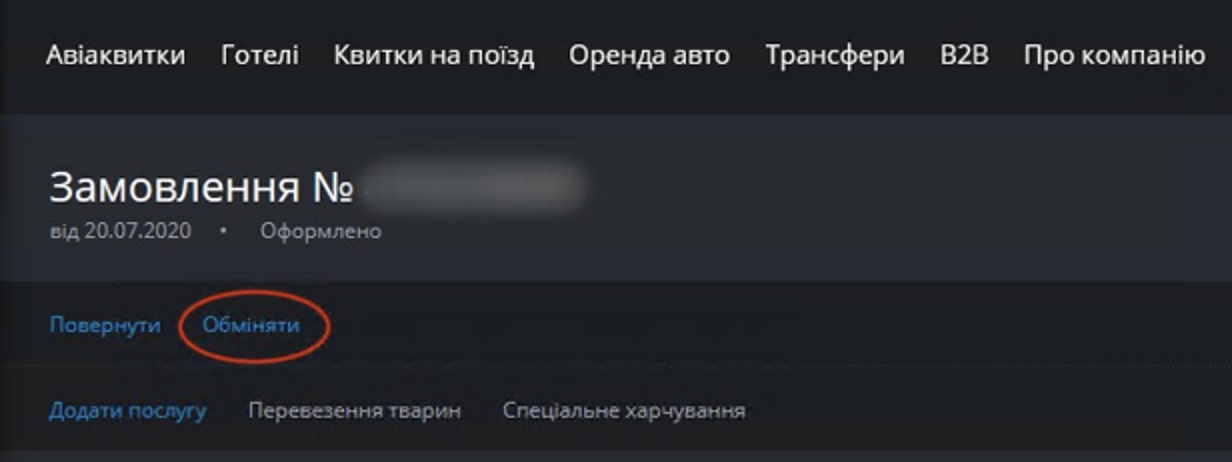 Відкрийте особистий кабінет, виберіть у пункті «Мої замовлення» квитки, які бажаєте обміняти та натисніть кнопку «Обміняти»: